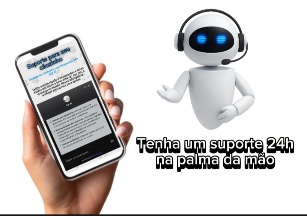 Inteligência Artificial personalizada, que responde suas dúvidas sobre cuidados, alimentação, comportamento e saúde 24h por dia — como se tivesse um veterinário ao seu lado sempre que precisar.